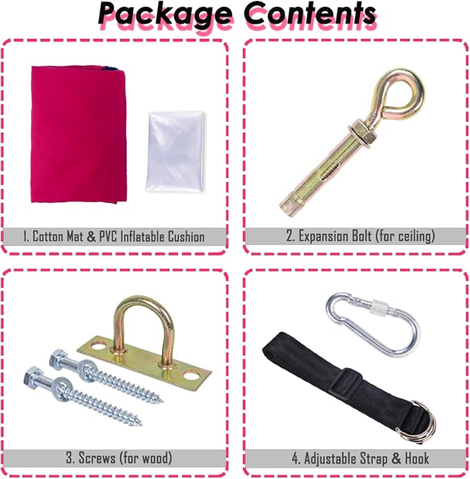 - ★Good Quality of Material – 100% Cotton Mat and Environmentally-friendly PVC Inflatable Cushion. Strong metal screws(for ceiling), hook and adjustable strap.