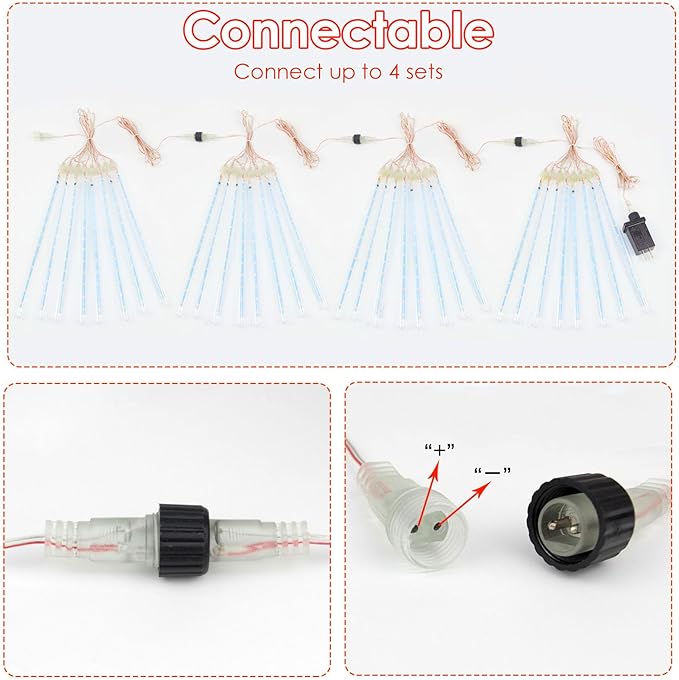 - Red and White Meteor Shower Rain Lights: Each package contains 2 sets of connectable lights. Each set light has 8 tubes with 192 LEDs. Total 16 tubes with 394LEDs. The LEDs are double-sided inside the tubes which make it illuminates from any angle