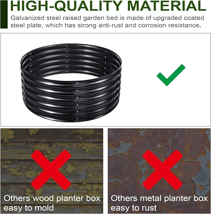 - Heavy-Duty Galvanized Steel: The 17" Tall, 42" Round Galvanized Raised Garden Bed Kit is made with three-in-one layering consists of a durable steel core, followed by a protective galvanized layer, and topped with a robust colored coating, enabling it to withstand prolonged exposure to elements like sunlight, rain, and snow.