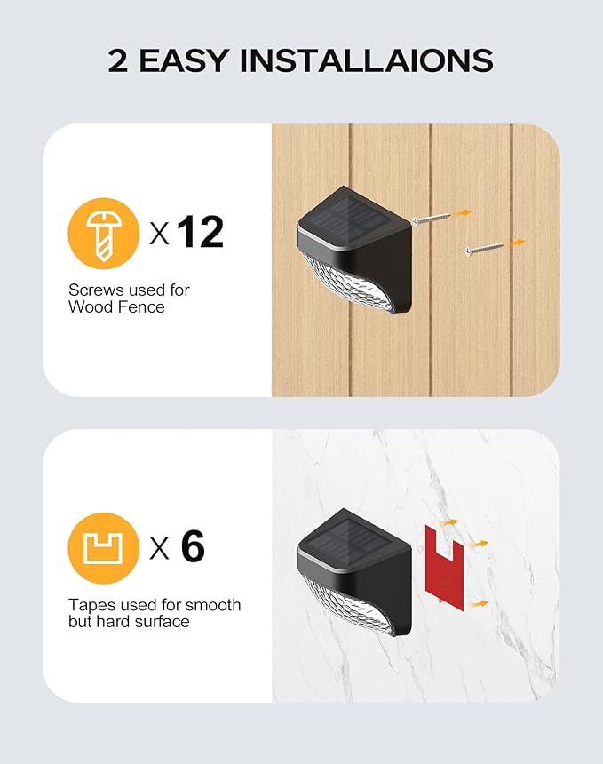 - 【Dual Lighting Colors】This solar pathway lights is equipped with two-color temperature lamp beads, you can randomly choose or change the warm white light or cool white light according to your needs, perfect decorative solar fence lights for your garden, patio, fence, yard, pathway, driveway, stairway, etc. 【Attention】PLEASE NOTE that before installing the light with the tape or screws, please ENSURE the switch is "ON". Left side ON is warm light mode, Right side ON is cool light mode.