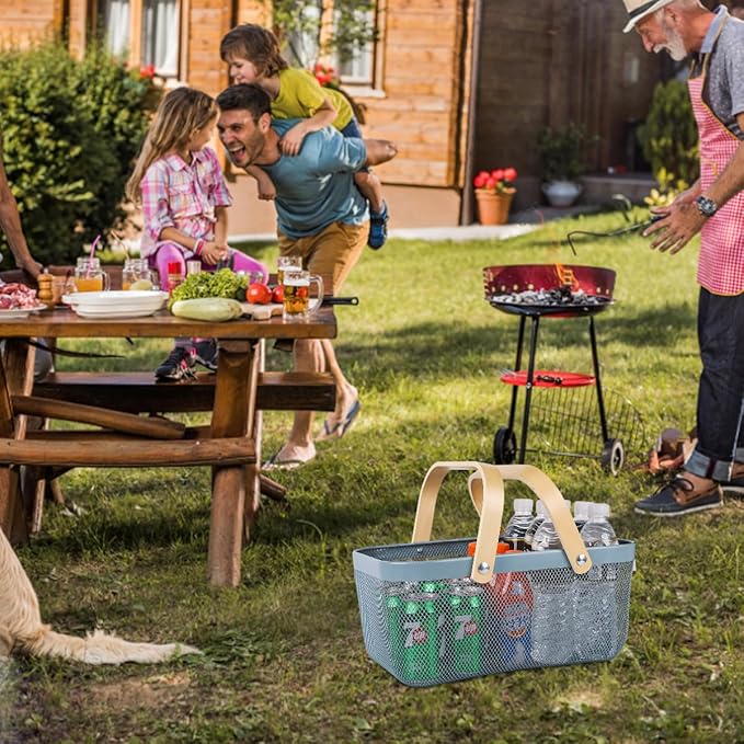 Portable Mesh Harvest Basket - Natural Bamboo Handle Foldable Organizer for Kitchen, Garden & Picnic | Ventilated Storage Bin with Rust-Proof Wire, Space-Saving Farmhouse Decor (Blue)