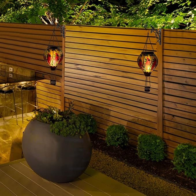 - 【Unique Hot Air Balloon Design】--This hanging solar light is composed of 8 pieces of cardinal glass with lifelike flame lights. As night falls, their glow adds warmth and comfort to your garden, patio, yard, path, and more, great Christmas decorative lights.