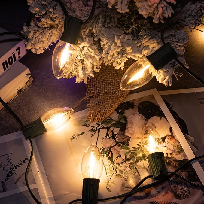 - Vintage C7 Christmas String Light: 50ft outdoor string light with 52 led bulbs(2 spare) , warm white light emanates from the transparent bulbs, creating a vintage ambiance effect, adding a romantic atmosphere to your home