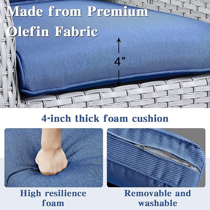 - 4.Comfortable And Easy To Clean: Both chairs in this outdoor patio set are equipped with 4-inch thick foam seat cushion and 8-inch thick cotton back cushion, which is ergonomic and improves the overall comfort of the wicker chair. The patio chair cushion covers are made of outdoor specialty olefin fabric that is water resistant, and each cushion is equipped with zippers that are removable and easy to clean.