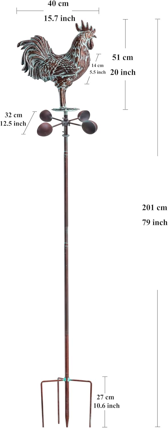 - Metal Rooster Statue Wind Spinner for Yard and Garden - The rooster sculpture garden stake measures 79" H x 15.7" L x 12.5" W. This vintage-style vintage metal chicken decoration not only enhances your gardening decor but also serves as a conversation starter, making it a unique addition to outdoor. Perfect decorative accent piece to enhance rustic, country, or farmhouse style outdoor interiors