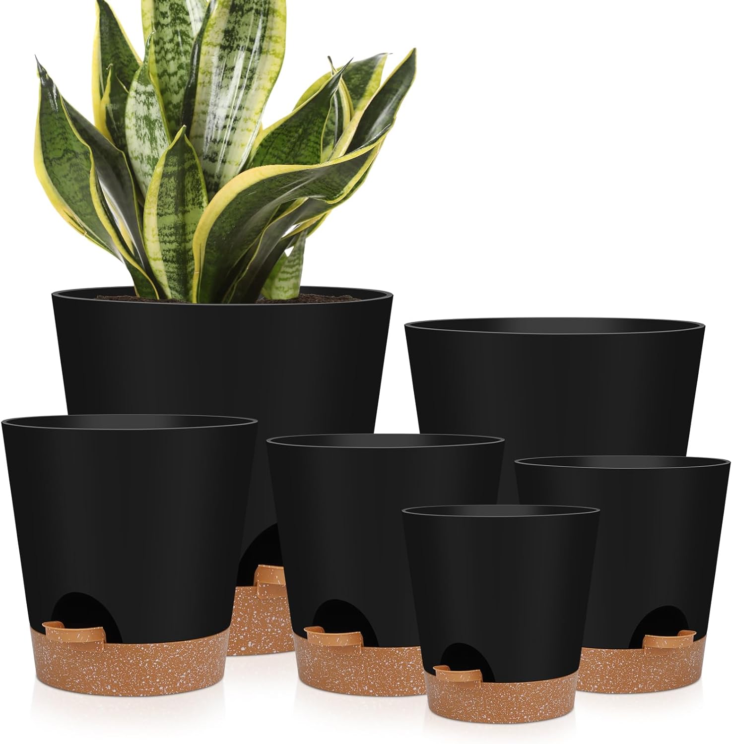 Indoor Self Watering Planters with Drainage Holes and Saucers, 8, 7, 6.5, 6, 5.5, 5 Inches, Black, 6 Pots