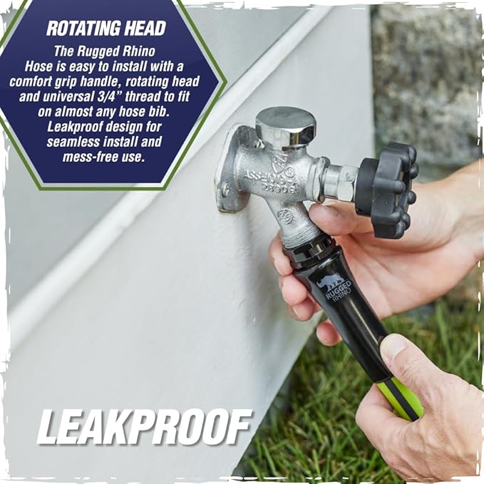 - LEAKPROOF: no need to worry about leaks and mess; hose features leak free rotating head and universal 3/4 GHT Garden Hose Thread fitment for easy install that grips tightly to almost any hose bib