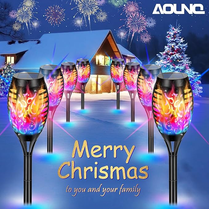 - đ„ăGorgeous Color Dance Famesă: Happy Christmas! Our solar Christmas light with multi -color flame is an excellent choice for outdoor Christmas decoration.The solar Christmas lights are designed according to the real flames. While flashing the gorgeous multi -color dance flames, it will emit safe soft and enhanced emotional light.This makes solar lights can effortlessly become the talk of the neighborhood, transforming your house magically into a Christmas wonderland.
