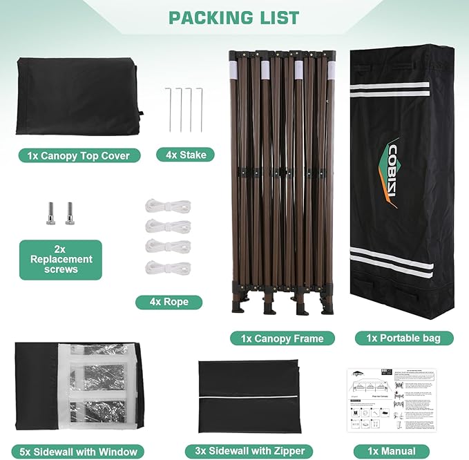 - 【Included Accessories, Warranty Service】 1x Commercial Grade 10x30 Pop Up Tent Frame, 1x Top Cover, 6x PU Coated Panels (4 x Sidewalls with Windows and 2x Sidewalls with Zippers), 8 x Ground Pegs, 4x Windproof Ropes, 1x Carrying Bags, 1x Manual. We provide 1 year warranty service. If you have any problems and questions, please feel free to contact us, we will give you the best help. Choosing us means choosing a comfortable life.