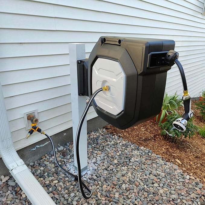- 【Tidy Looking in Yard】: The guide mechanism in hose reel that shifts from side to side to evenly distribute the hose and keep organized. And the included hoses all have a nice smooth glossy finish that washes off easy after being dragged through garden dirt and mud which makes keeping clean a snap before storing the hose away.