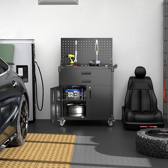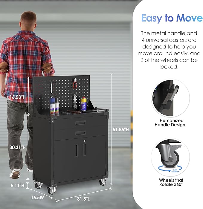 - Large Storage Capacity: The tool cart on wheels has 2 drawers and 2 lockable doors, providing ample storage space for your tools and accessories. The 2 drawers can hold small tools and accessories, such as screwdrivers, pliers, and wrenches.There is an adjustable partition inside the cabinet below, provide sufficient space for your household goods
