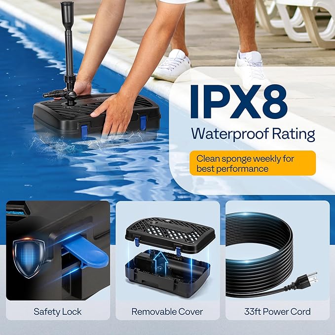 - EASY SETUP & MAINTENANCE: Designed for hassle-free setup, this plug-and-play unit requires no tools or complex assembly; Suction cups secure the base to the pond floor, while the removable cover and safety clasp allows for quick access to the filter media for cleaning or replacement, keeping your maintenance routine simple and efficient; Recommended to clean the filter sponge weekly for optimal performance; Includes a guide for easy lamp replacement