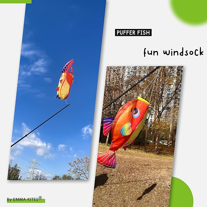 - emma kites 29-inches Puffer Fish Windsock easily catches your eye in the distance with its bright colors and vivid waves. The vibrant colors to brighten up your backyard, and a cute ocean friend to your family and neighbors, and to rise good days!