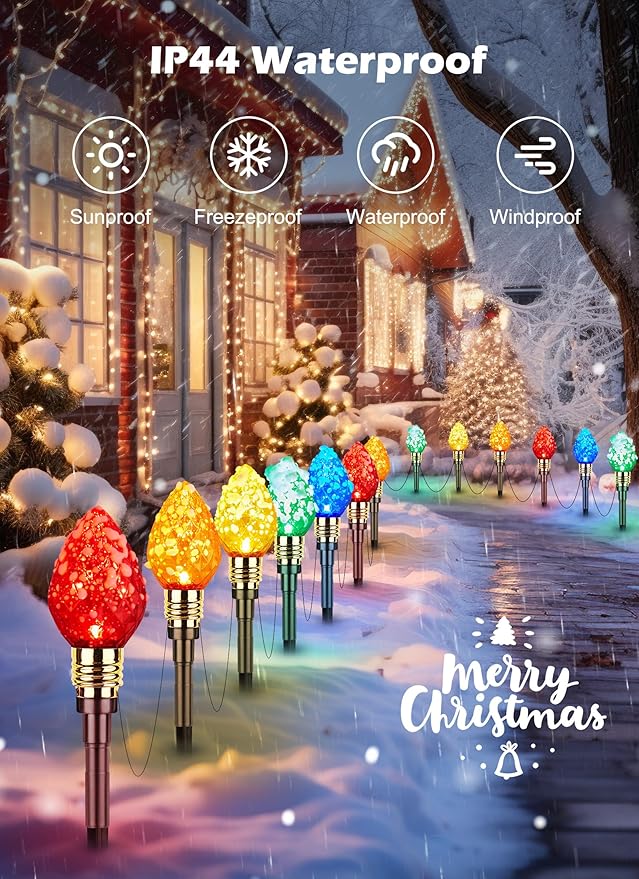 - New Strawberry C9 Christmas Lights Outdoor 2 Pack: Each pack 17.4 feet C9 Christmas stake lights with 10 multicolored strawberry C9 bulbs. 21 inches light spacing, 6.7 inches pathway markers, plug in and enjoy it. This outdoor christmas lights for the sidewalk will be great for your pathway, garden, courtyard, holiday decor