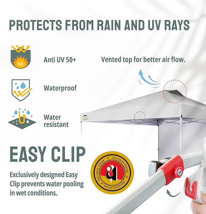 - EZ CLIP CANOPY FABRIC - The newly designed clip system makes it easy to attach the canopy fabric to the frame. The silver-coated interior provides exceptional UPF 50+ UV protection, ensuring cooler, safer shade. Made from rugged 150D fabric, the canopy is water-resistant and CPAI-84-rated for flame resistance. The canopy features integrated air vents, and the EZ clip system prevents wind lift and rain pooling, reducing fabric tearing risks. Ideal for outdoor events, weddings, and gatherings.