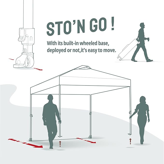 - STO’ N GO SYSTEM - Our lift-free system makes collapsing, storing, and transporting the 10x10 tent a breeze. The 10x10 tents can be stored with the fabric attached, with a specialized pocket for 4 sandbags, 8 stakes, and 4 guy ropes. Integrated wheels in the feet allow easy movement even when the instant shelter tent is set up, by simply lifting the side without wheels. This feature is especially useful for quick setup and takedown at locations like the patio or sports events