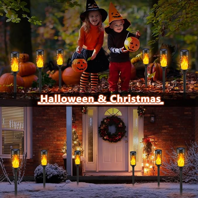 - Solar Outdoor Lights Waterproof: Solar lights outdoor waterproof equipped with enclosed design, can withstand most weather condition like rain and snow, which has better waterproof performance than general solar flame lights on the market. Attractive flickering flame solar torch lights will provide a warm and cozy atmosphere for your home outdoor decor.