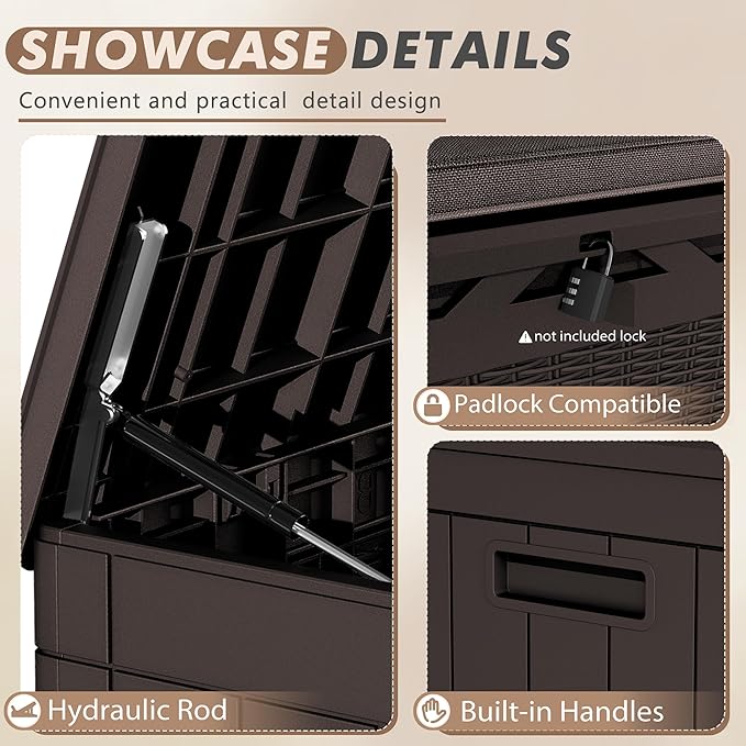 - Durable Resin Material: Deck box is made of waterproof resin, with a complementing rattan pattern design, effectively preventing fading and rusting, while also maintaining a fresh appearance even with all-weather use