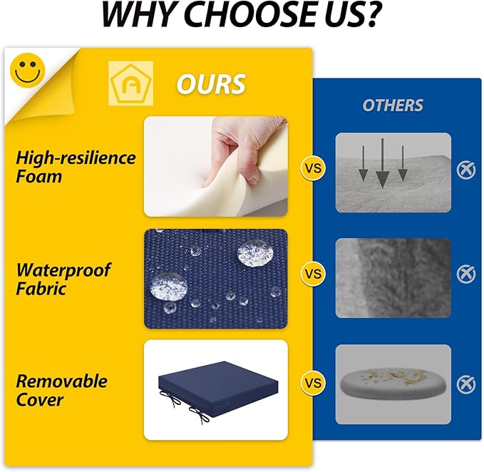 - Wide Use & Tips: These outdoor dining chair cushions fit pools, patios, balconies, decks, backyards, and gazebos. Foam inserts and covers are packed separately in bags and placed in one box—check all parts. Easy assembly required