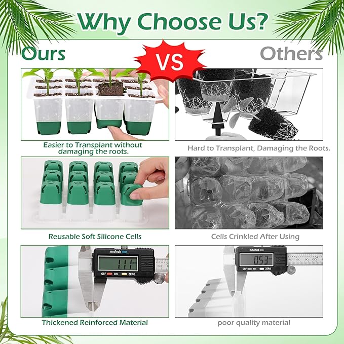 - 【Flexible Cells with Drainage】Experience the latest in growing tray design for effortless watering and transplanting. Our seed starter boasts multiple drain holes for efficient water drainage. The soft silicone cells delicately cradle seedlings, flexing gently to ease transplanting into your outdoor garden. Specifically crafted to minimize stress on seedlings, you can extract the entire root with soil, ensuring zero damage to your precious plants.