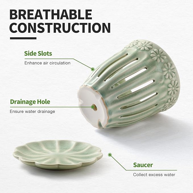 5" Ceramic Orchid Pots with Holes | Crackle Glazed Orchid Pot with Drainage and Separate Saucer | Ideal Plant Pot for Repotting Orchids and Other Flowers(Green)