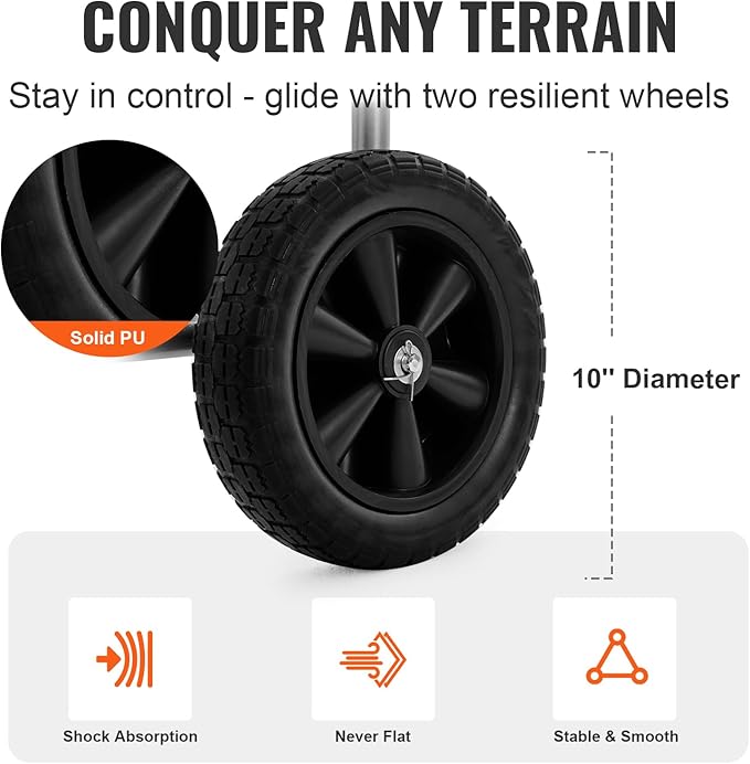 - Stable Mobility: A low center of gravity is beneficial in preventing tipping. The garden hose reel cart is equipped with four solid 10’’ PU wheels that are durable and suitable for various terrains. These wheels ensure effortless and smooth movement of the cart, even on rough or uneven ground.
