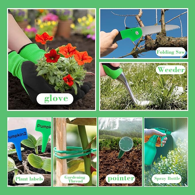 - Complete Gardening Tool Set: This landscaping tools set contains everything you need for daily garden maintenance. Includes hand trowel, transplanting trowel, garden rake, garden fork, saw, weed eater, weeding knife, and pruners, plus 10 tags, zip ties, seeder, watering can, gardening gloves, and stylish and durable gardening tote, This is a complete green team.