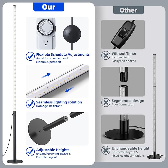 - Adjustable Height for Flexible Lighting : Experience the versatility of our upgraded vertical grow light. With an adjustable height range of 4ft-5.6ft, it caters to tall plants and large plant shelves, ensuring optimal illumination