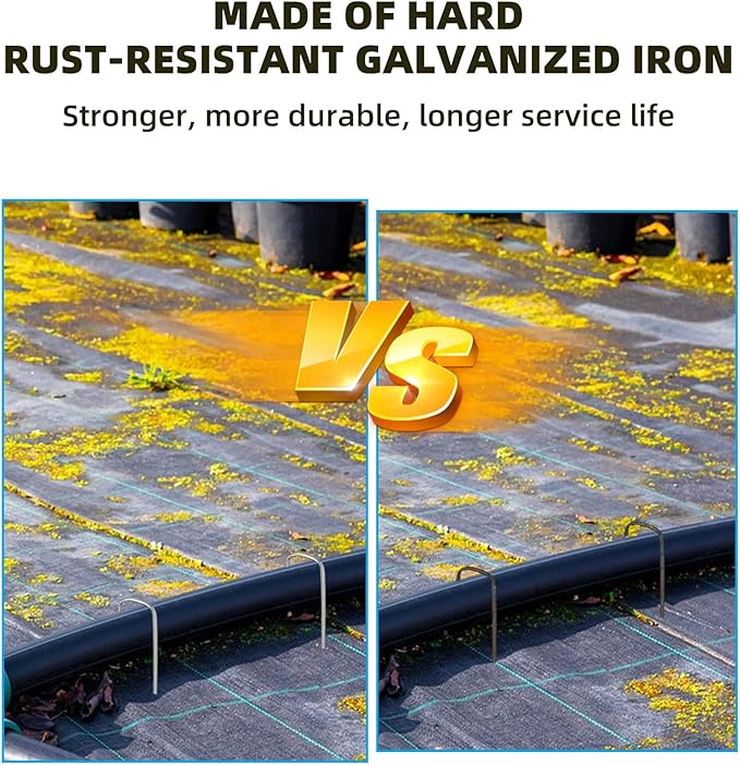 - 【Sharp End Design】: Galvanized landscape staples have sharp ends, which can easily penetrate turf, landscape fabric, heavy soil and weed barriers. Strong piles can be hung, anchored and secured. This pointed landscape pins is driven into the ground and it resists bending on impact.