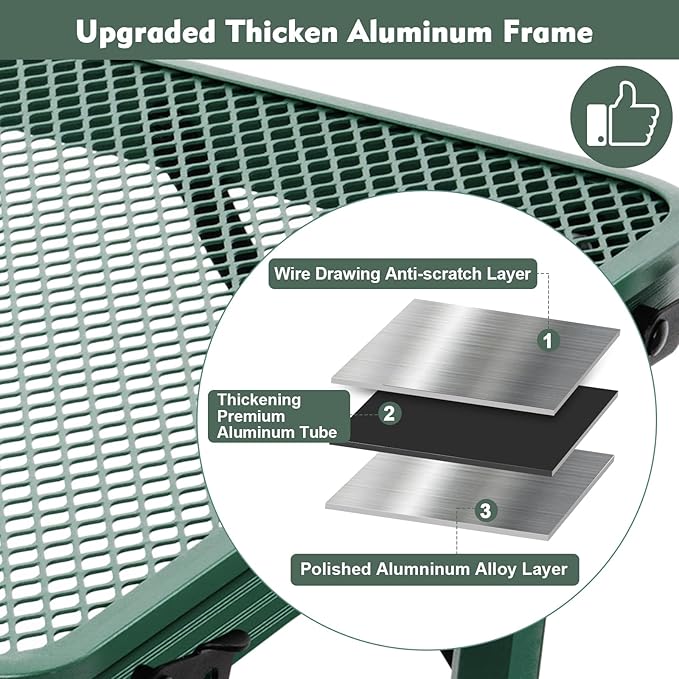 - [Robust and Sturdy] The folding table is made of high-quality aluminum alloy, ensuring its sturdiness and durability. The table top is designed with a metal mesh surface and has been treated with a thickened paint coating, allowing it to withstand prolonged exposure to high temperatures. When stored in the garden, it is resistant to rain and snow, as the limited contact area with the table surface minimizes the risk of staining and rusting