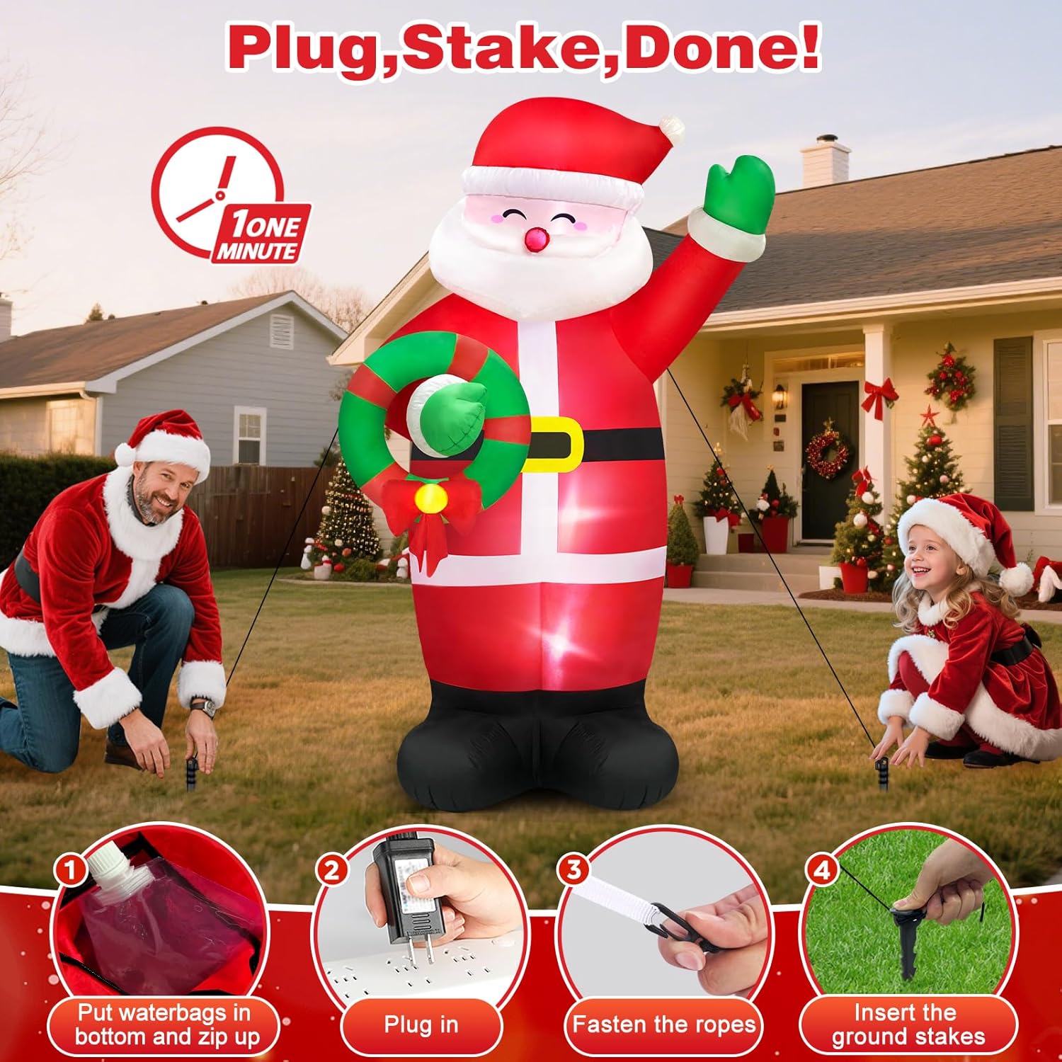 - 🌧️ Super Stable & Secure: Santa Christmas blow up yard decorations provide 5 ground stakes, 2 fastened ropes and 2 plastic bags. "2 plastic bags" can be filled with water and placed on Inflatable's bottom to add weight and make it more stable. Don't worry about your Christmas inflatables outdoor being blown away by the wind