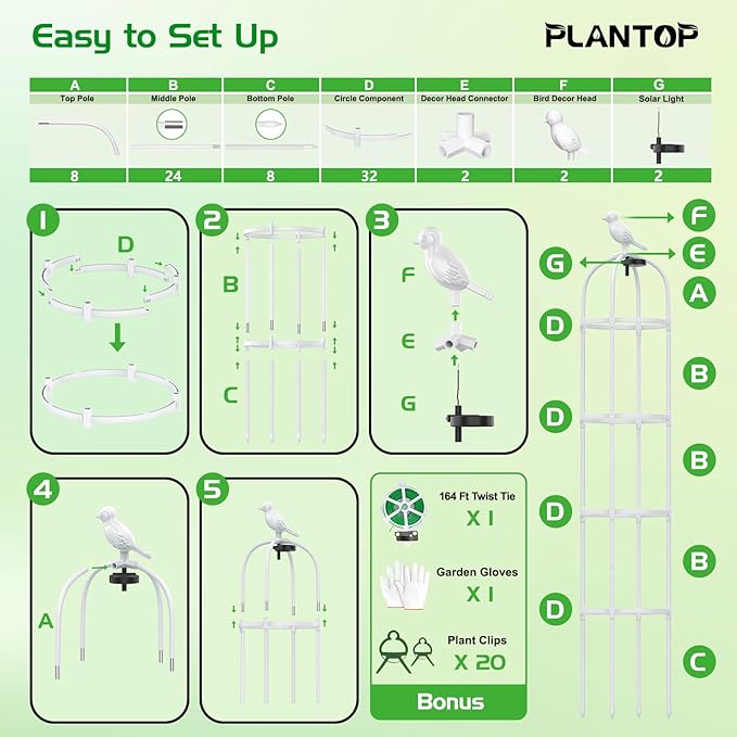 - 👍「Effortless Assembly」- Say goodbye to complicated setups and tools with this easy-to-install plant support trellis. Simply rotate the pieces to the correct angle and position, assembling from bottom to top with no screws, wrenches, or screwdrivers required. For optimal stability, pre-drill holes in the ground to facilitate inserting the garden obelisk trellis. To enhance sturdiness, the garden trellis can be inserted deeper into the soil for added stability.