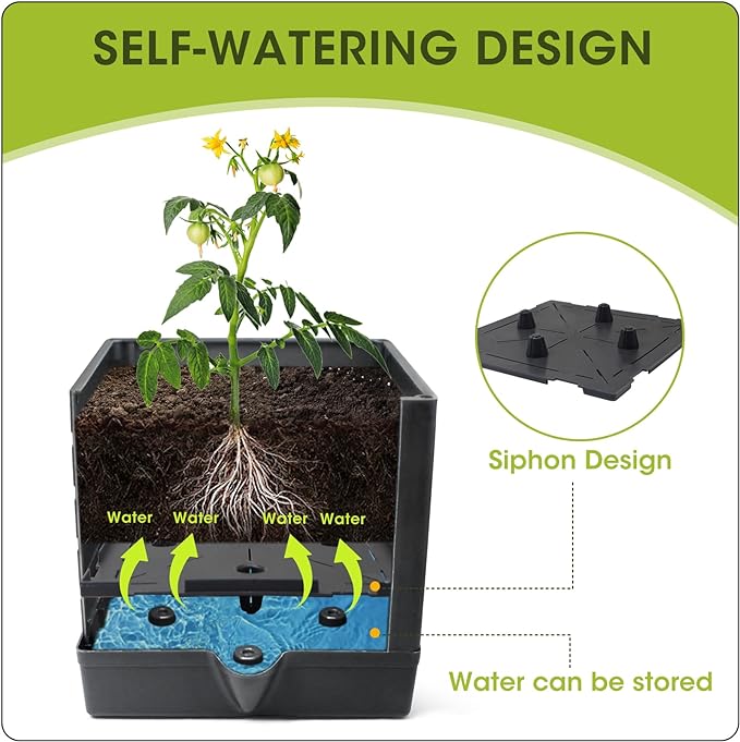 - SELF-WATERING SYSTEM: Self watering tomato planter with trellis has a built-in reservoir that ensures the plants receive consistent hydration. The bottom grid design utilizes the siphon effect, allowing the roots to pump water efficiently, minimizing the risk of under-draining or over-draining. There is a water injection port on the side, and the right amount of water is poured into the sowing box, without daily watering.