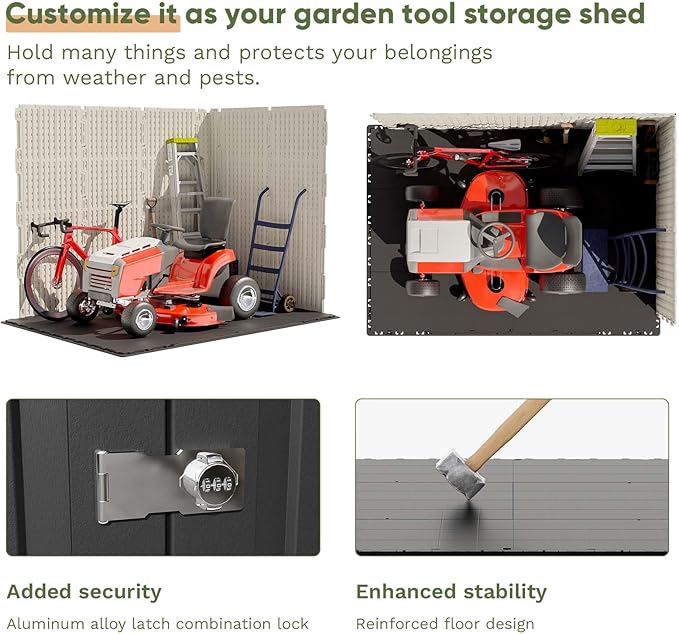 - Plastic Floor Base Provides High Stability: The plastic floor base is sturdy and reliable, providing a safe place to store all of your outdoor tools and equipment. It adds an extra layer of protection against water damage and moisture, ensuring that your belongings remain safe and dry.
