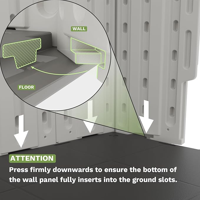 - Interesting “Kick-it” Installation Process: This shed reduces the number of screws needed by 35%, making assembly quicker and easier. * When installing wall panels with a kicking action, press firmly downwards to ensure the bottom of the wall panel fully inserts into the ground slots. As shown in the video, once the bottom of the wall panel aligns perfectly with the ground, proceed with the kicking action.