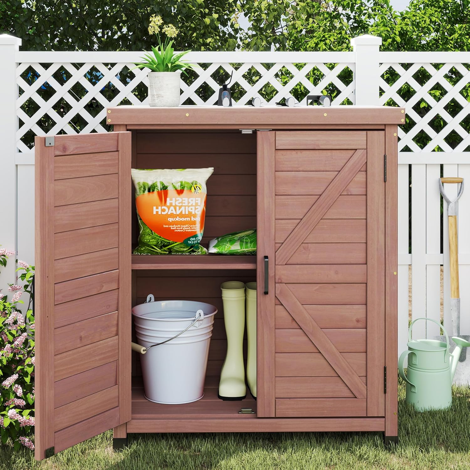 Outdoor Storage Cabinet & Potting Bench Table with Metal Top, Wooden Patio Furniture, Garden Workstation (Royal Brown, 36x31x17in)