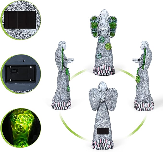 - 💎Solar Angel Statue Outdoor: The angel statues with eyes closed,holding the bible praying, wing emitting sparkling light and possessing divine power. she seemed to be praying.The Lord is my helper;I will not be afraid.