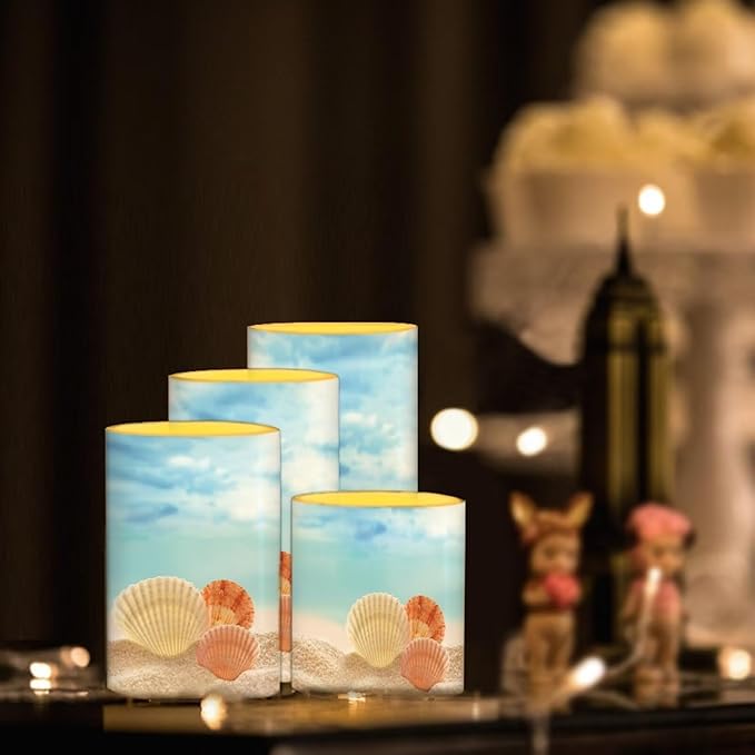 Flameless Candles Battery Powered LED Candle with Remote Timer Color Changing Control Set of 4 for Indoor Outdoor Beach Wedding Home Indoor Coastal Decor, Beach Seashell Blue
