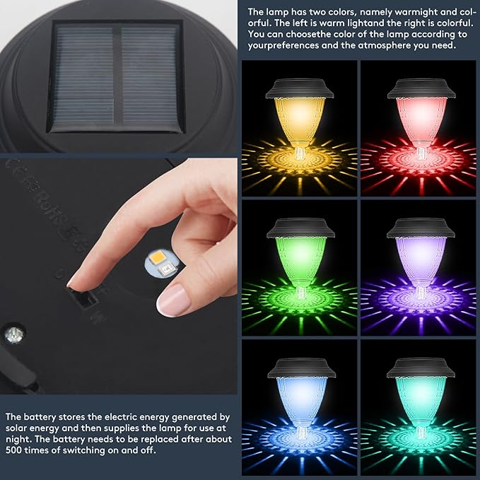 - Upgraded Solar Light: Solar light has a waterproof solar panel, built-in light sensor, have longer lighting time and brighter lighting. Simply press the button to the "ON" position at first use, automatically charges for 6-8 hours during the day and turns on automatically for 8-10 hours in the dark. Suitable for any outdoor weather conditions: sun, wind, rain, snow, frost or sleet
