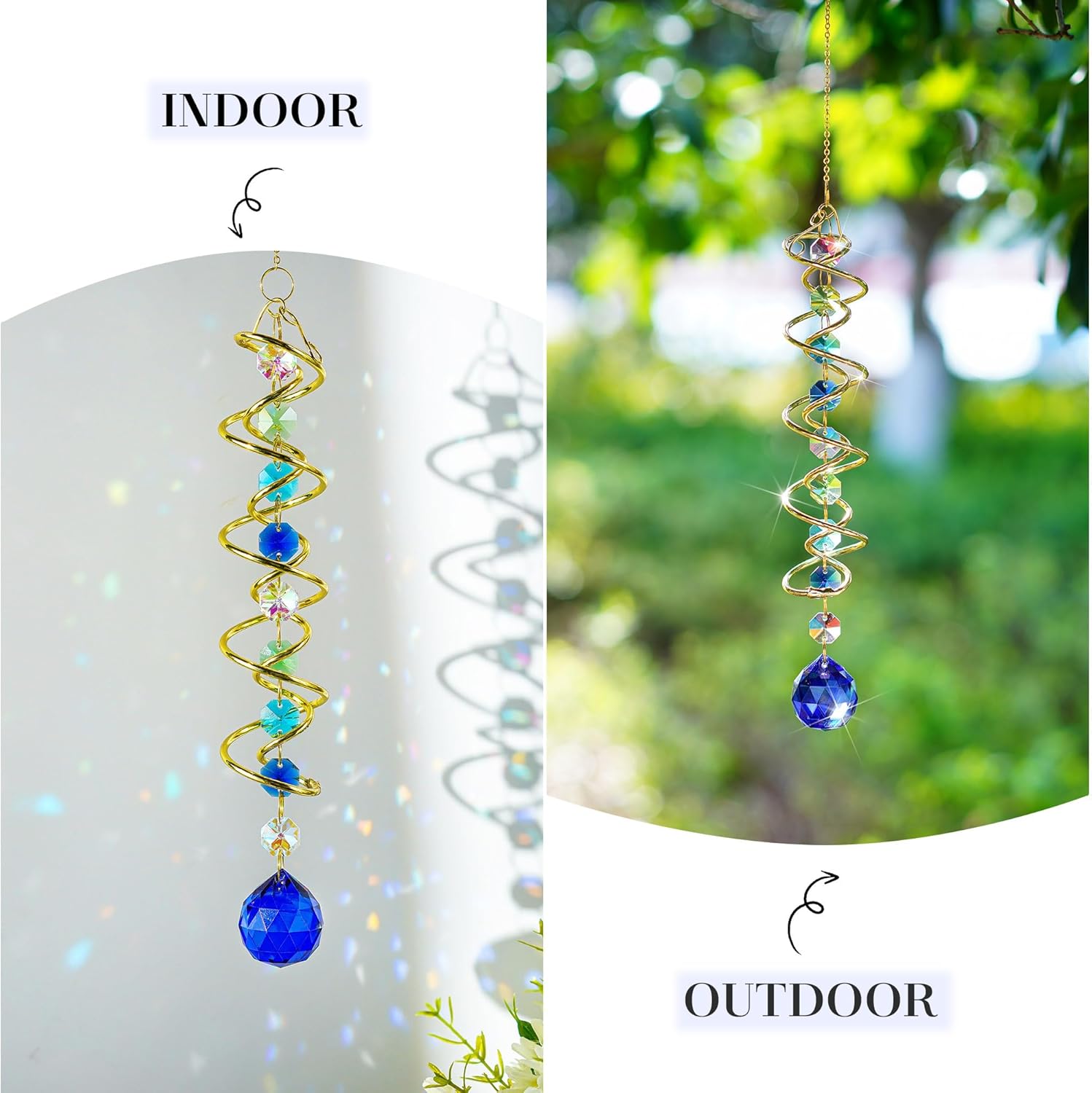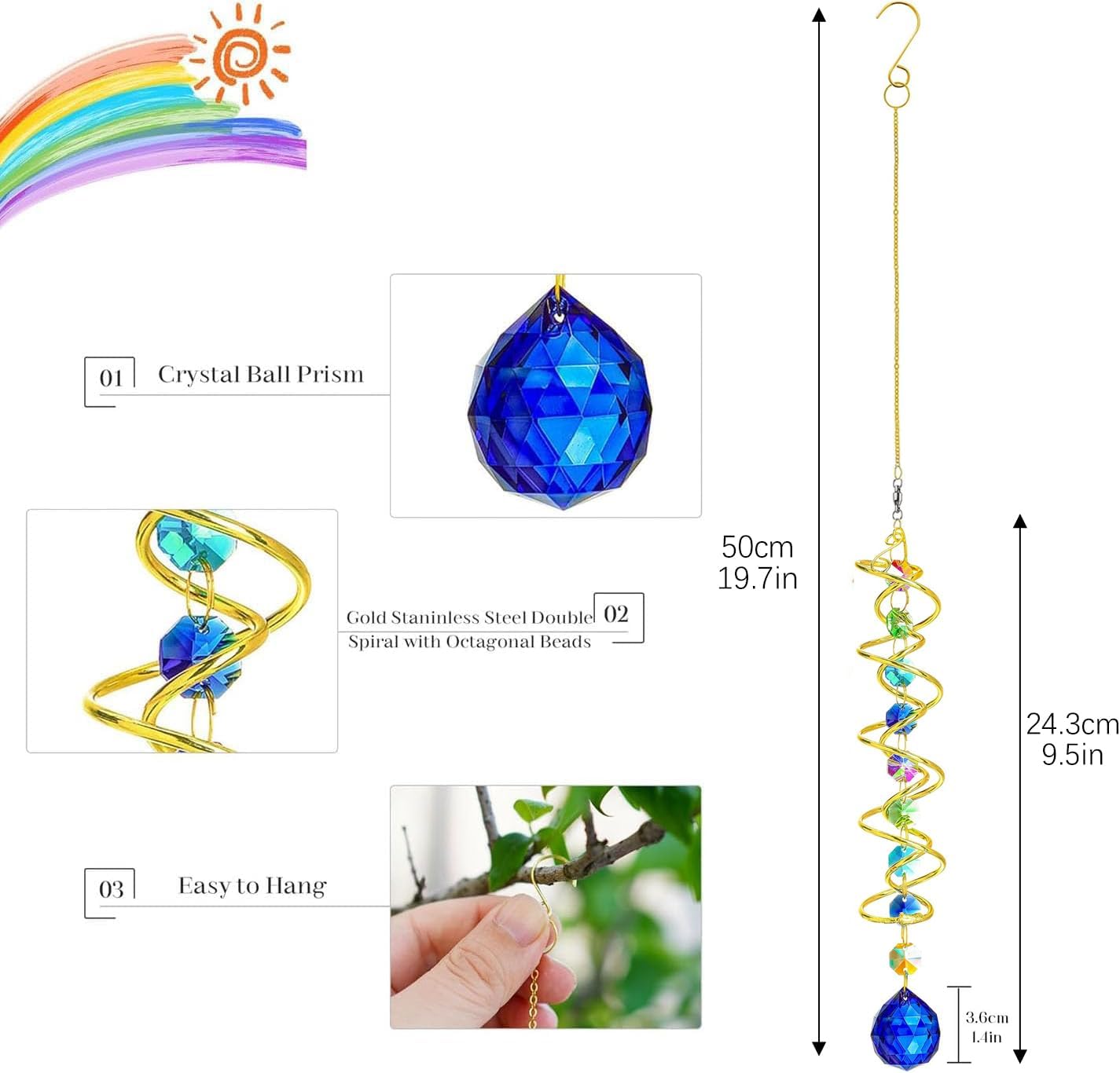 - Vibrant Blue Crystal Glass Ball: Adorned with a 1.18 inch blue crystal glass ball, this window suncatcher hanging adds a pop of enchantment to any garden or patio.You can also add a motor(not include) to let the spiral to spin ,while spiral tail rotating (it can’t spin by itself)