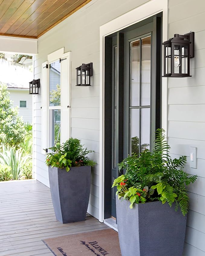 - đăHigh-Quality Construction & Tempered GlassăOur exterior light fixture features a sturdy die-cast Aluminum frame with a bronze finish, ensuring superior craftsmanship. These waterproof, anti-rustic, and weather-resistant wall sconces are built to last. Unlike fragile glass panels, our outdoor wall lights for house are equipped with high-tempered seeded bubble glass that is strong and durable. The seeded bubble glass enhances the light, creating a warm and inviting atmosphere in your house.