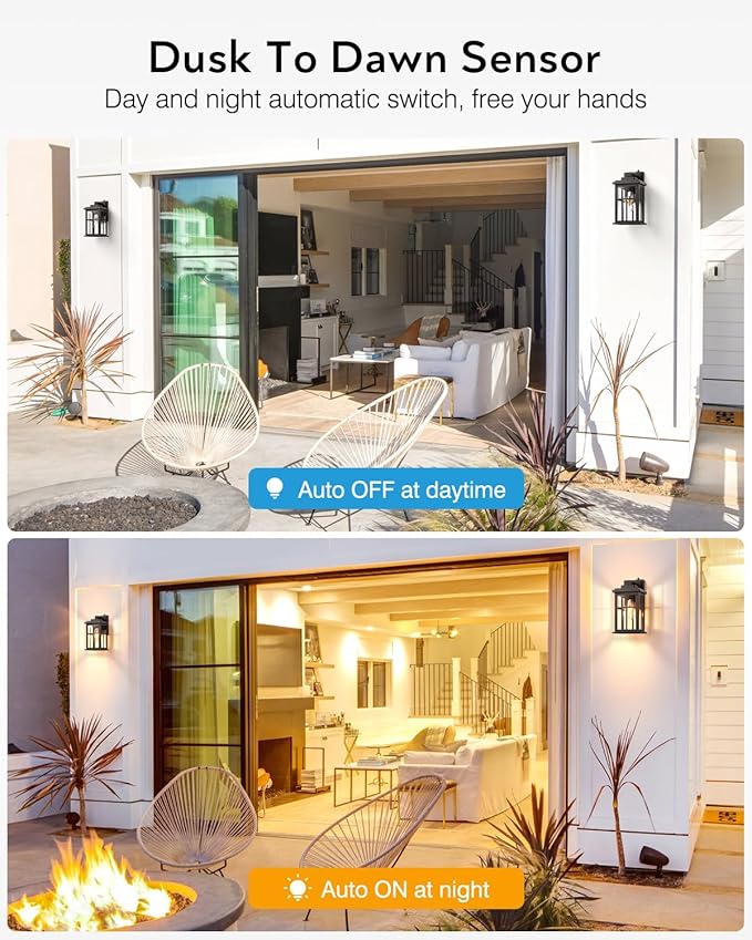 - đăAdvanced Dusk to Dawn SensorăExperience the smart functionality of our outdoor porch light, thanks to its advanced dusk to dawn sensor. Equipped with a high sensitivity photocell sensor, these dusk to dawn led outdoor light intelligently turn on at dusk and turn off at dawn, based on the surrounding brightness. Free yourself from the hassle of manual operation and enjoy energy savings, bringing you unparalleled convenience in your day-to-day life.
