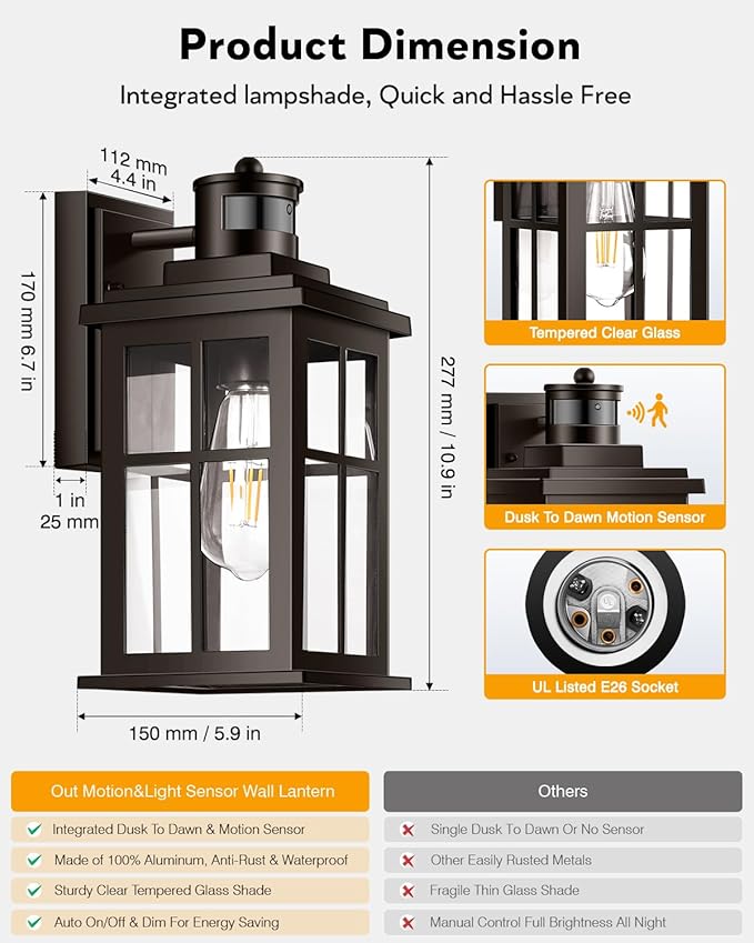 Motion Sensor Exterior Light Fixture, Bronze Dusk to Dawn Outdoor Wall Lights, Waterproof Exterior Lights for House, Porch, Doorway, Garage, 100% Aluminum