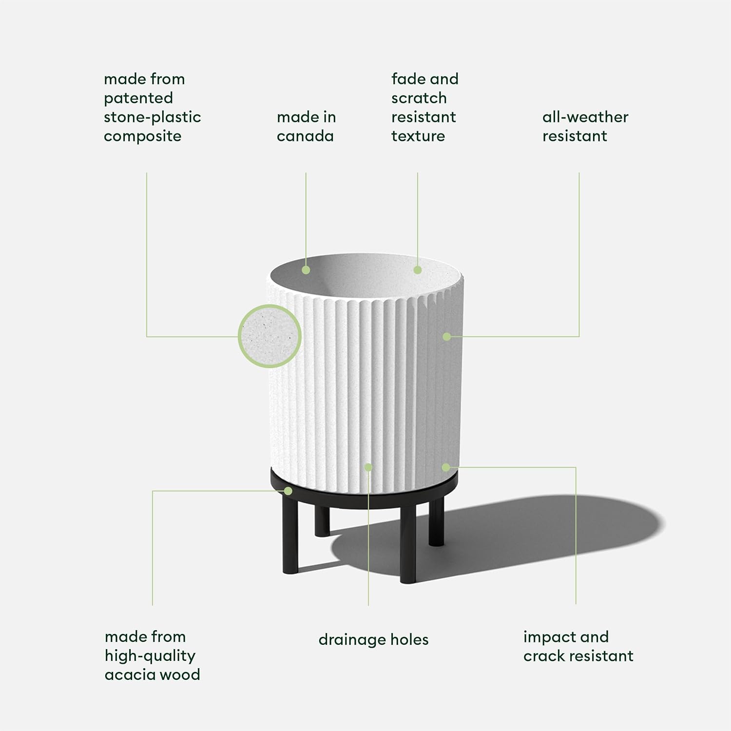 - DURABLE MATERIAL: Made from a patented plastic-stone composite, this fluted planter has a subtle textured finish and is all-weather resistant to cracks, scratches, UV and fading; perfect for hot or cold climates ranging from -20 to +120 degrees