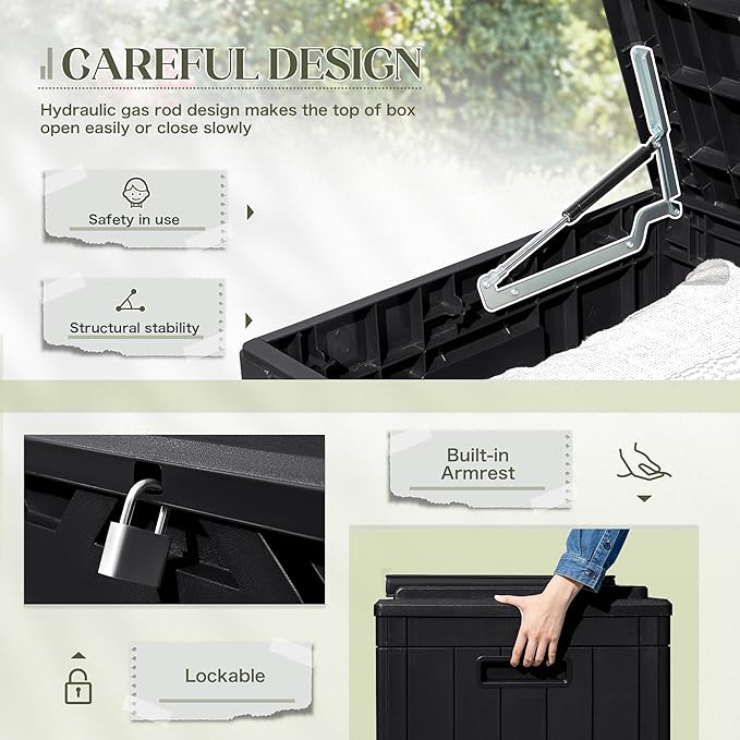 - EXTRA CUSHION:Besides helping you to organize your space, the deck box is equipped with a removable thick cushion, you can also use it as a stool to ensure your safety when opening and closing the box.