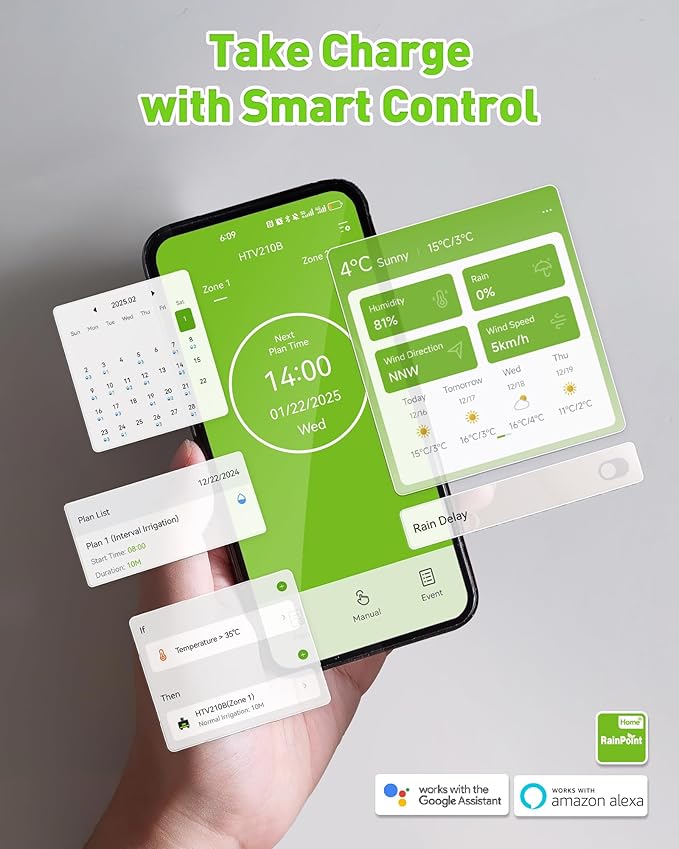 - 【Irrigation Made Smarter】 Use Smart Scenes to both automatically adjust your watering schedule based on weather conditions and to enable linkage between multiple RainPoint devices, making your garden system smarter.