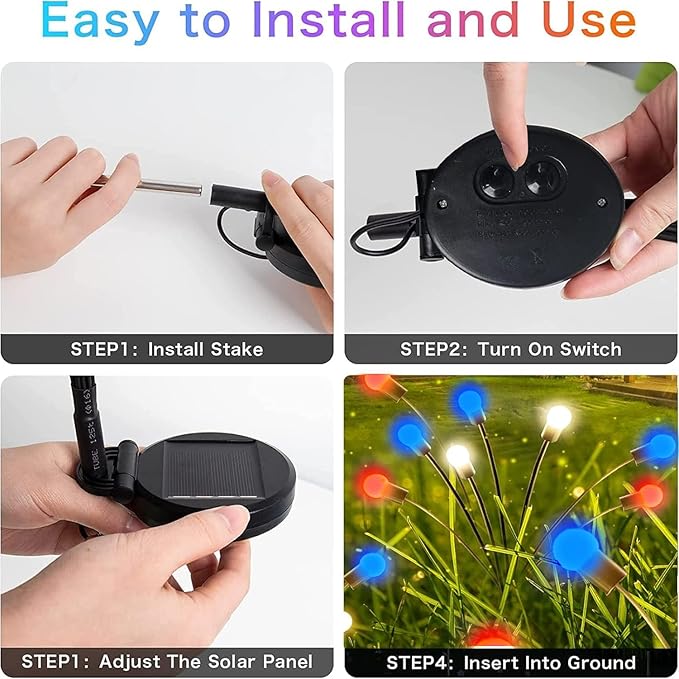 - Simple Installation: Designed for easy installation, our firefly lights require no professional tools or skills. Simply place the solar panel in a sunny spot and stake the lights into the ground. You can effortlessly enhance your outdoor space with the captivating colors of the American flag.