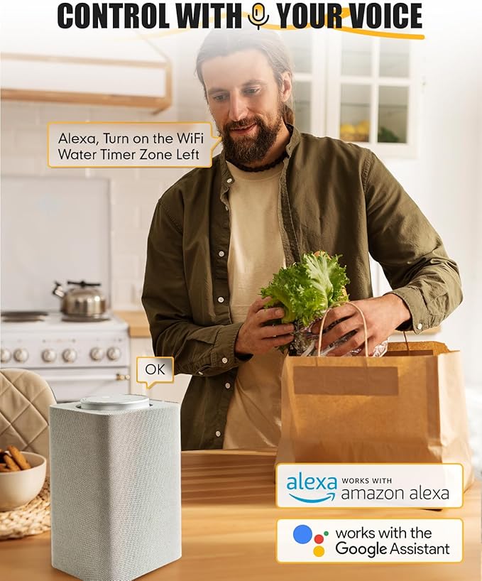- FLEXIBLE MANUAL WATERING: The manual watering time for each zone can be set from 1~59 minutes, and you can enable manual watering for the left/right/two zones via the APP, the button on the water timer, or voice commands to Alexa/Google Assistant.
