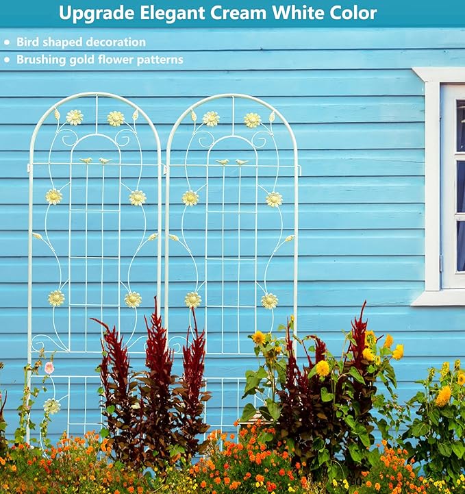 - Plants Supporting Trellis: This Cream White metal garden trellis is perfect for supporting all kinds of flowering trellis plants, wall-climbing vines. It allows them to grow naturally up towards the top.