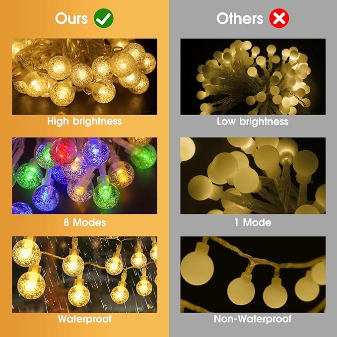 - Upgraded tring Lights:22.9 feet outdoor string lights with 70 Super Bright LED crystal globes. Each globe has a diameter of 17.5 mm, which is much larger than the others. What is the difference? Means you can get higher brightness and more gorgeous lighting effects. Unlike other black wire fairy light, this battery string lights use transparent tube to wrap string, making it consistent with the crystal ball style, which is not make people feel weird